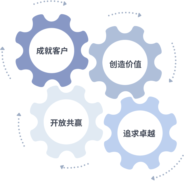 成就客户是一切决策的出发点,,,创造价值是衡量所有工作的标准,,,追求卓越是我们做事做人的态度,,,,开放共赢是我们的格局也是最终的结果。。价值观的齿轮环环相扣,,推动着组织里的每个人不断向前。。